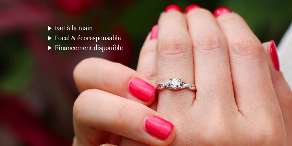 Flamme en rose est l'une des plus importantes bijouteries au Québec grâce notamment à la qualité de fabrication et à l'originalité de ses collections exclusives de bagues de fiançailles et de bagues de mariage. Fondée en 2009 par deux joaillières formées à l'école de joaillerie de Montréal, Flamme en rose crée des bijoux qui respectent les normes de protection de l'environnement et du développement durable. La bijouterie de Montréal utilise des métaux recyclés dans la fabrication de toutes leurs bagues de fiançailles, bagues de mariage, pendentifs, boucles d'oreilles et bracelets tout en s'assurant de la traçabilité des pierres précieuses. Les deux fondatrices ont misé dès le départ sur l'emploi de diamants créés en laboratoire et de moissanite, considérés éthiques et écoresponsables.
