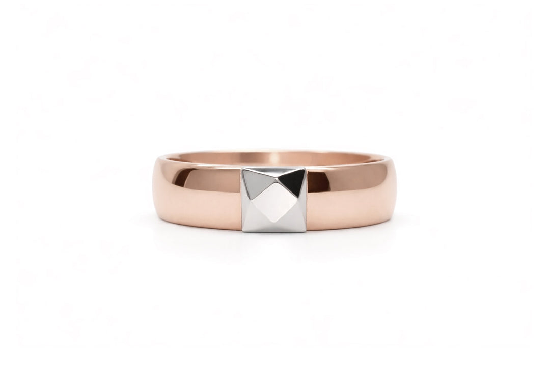 - Jonc demi-rond unisexe avec insertion d'un centre facetté en or blanc pour créer l'effet d'une pierre.