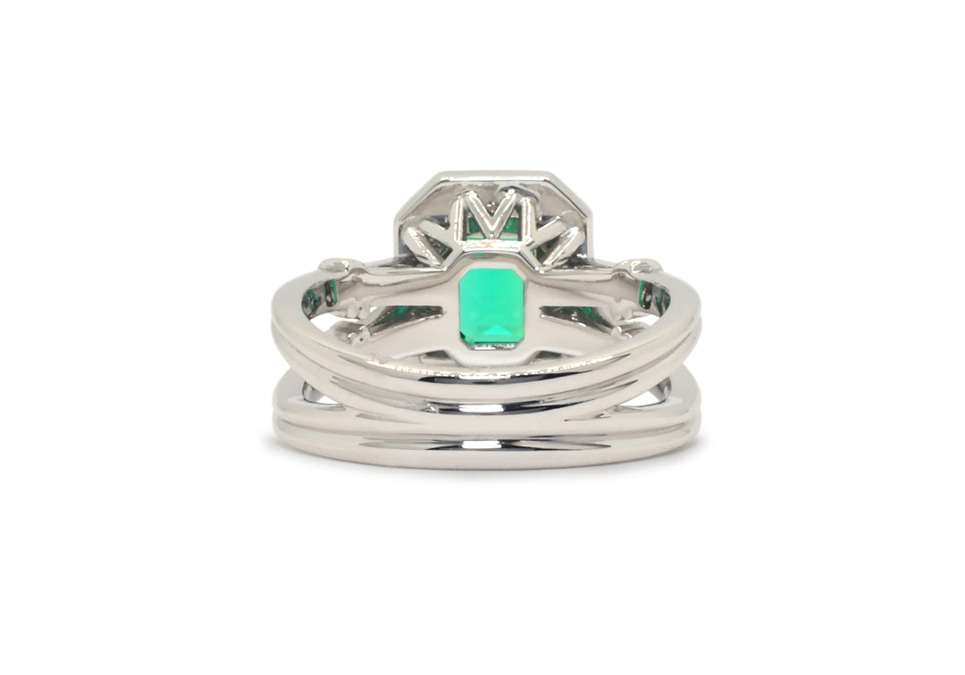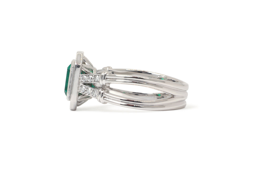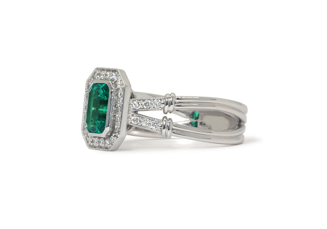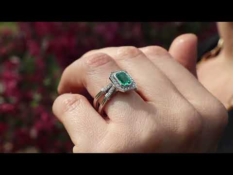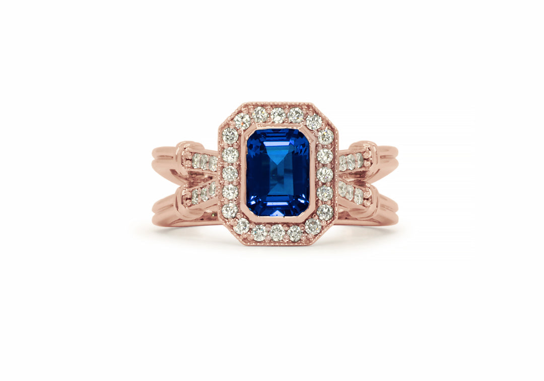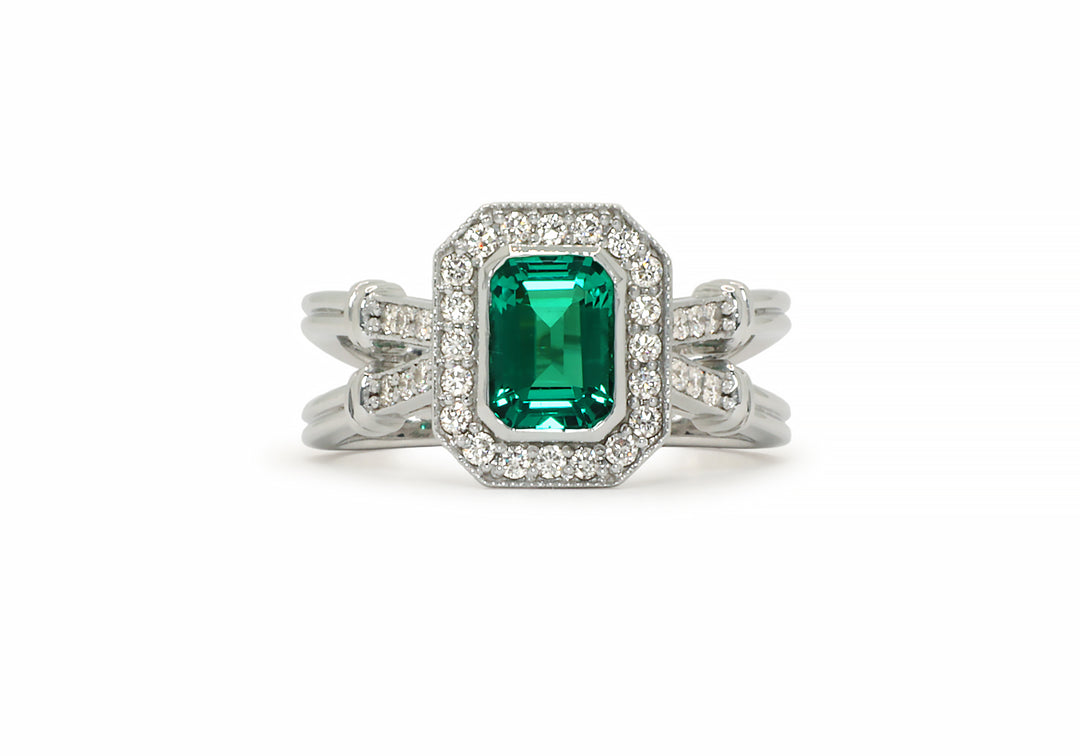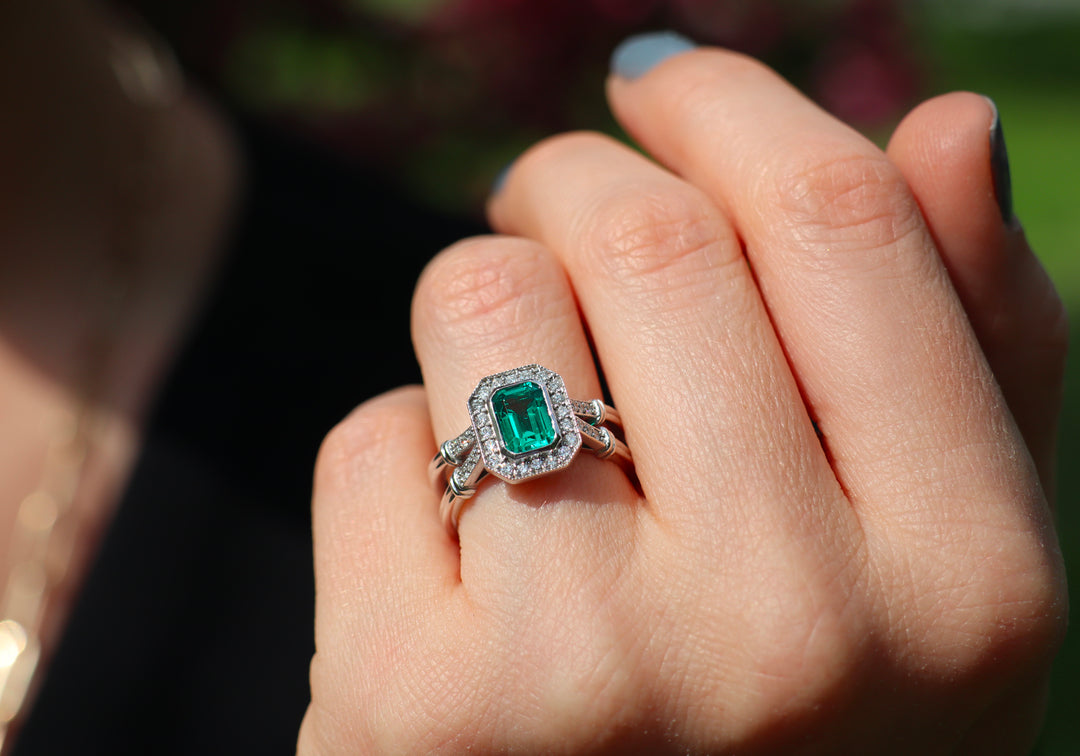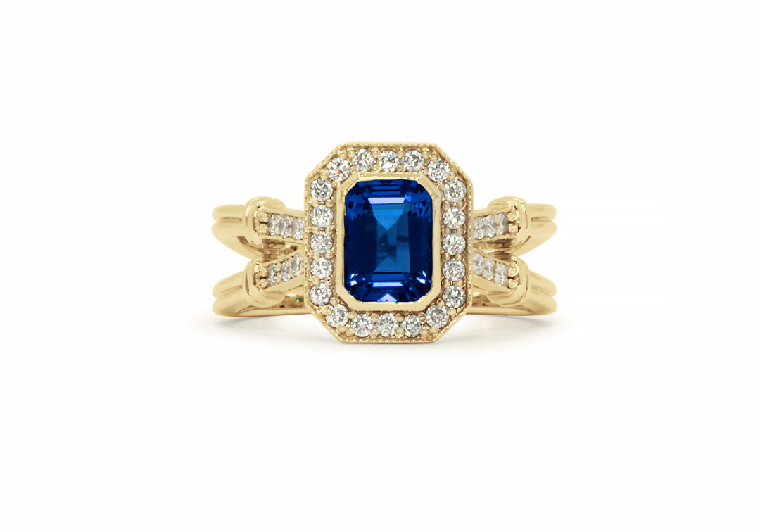 • Bague avec émeraude ou saphir coupe émeraude de 7 mm x 5 mm.