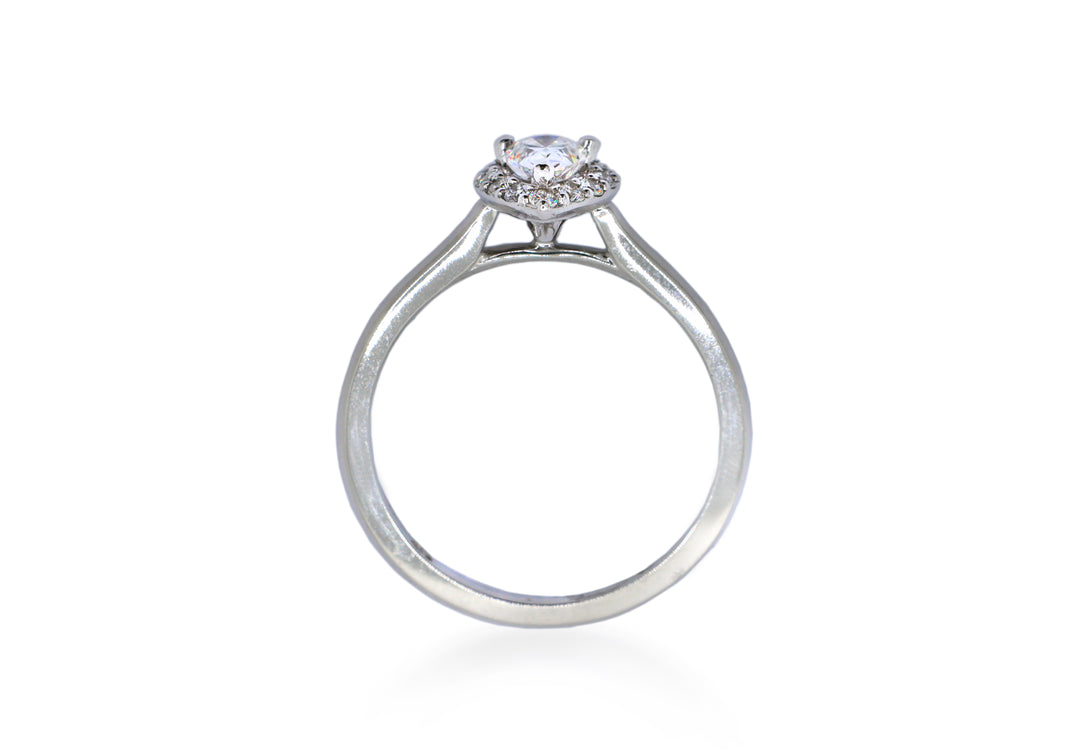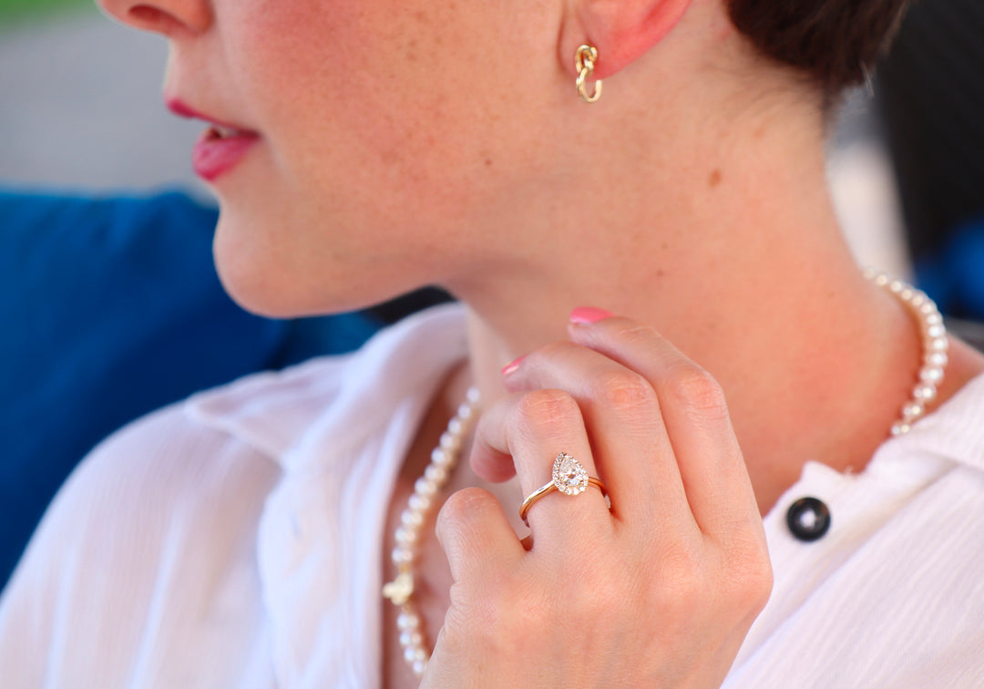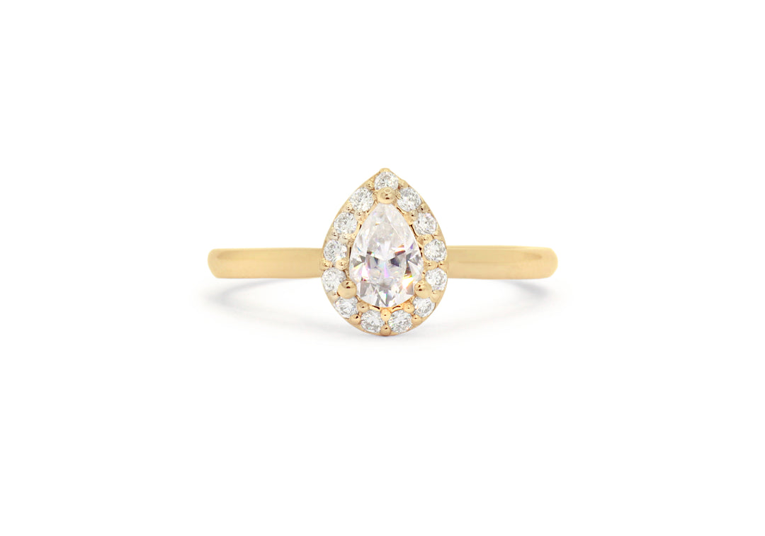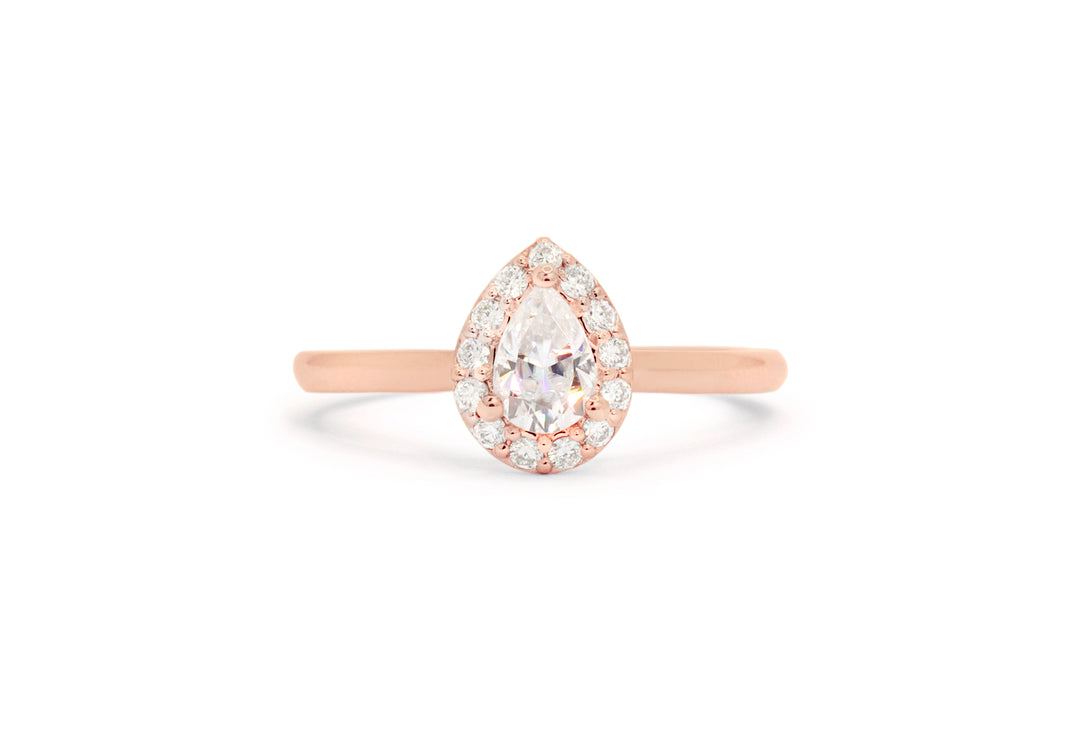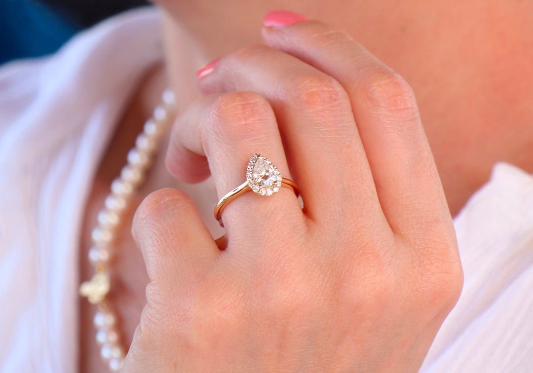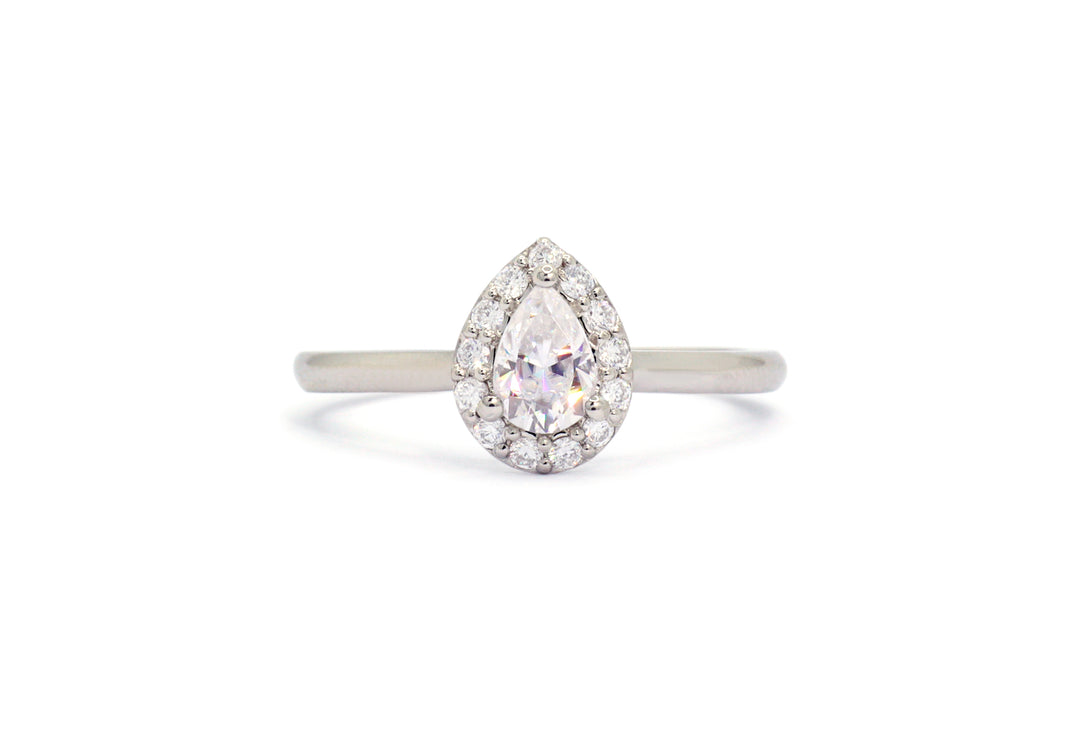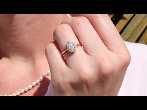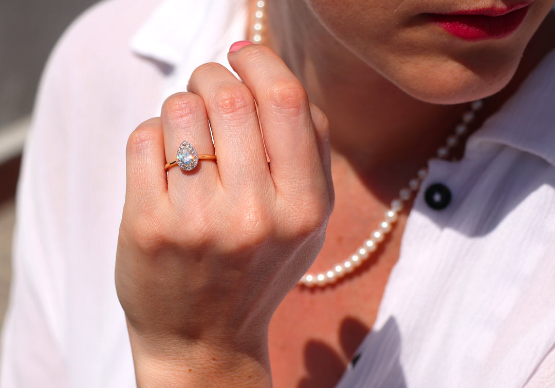 - Un solitaire en forme de goutte cintré en halo par un pavé diamants.