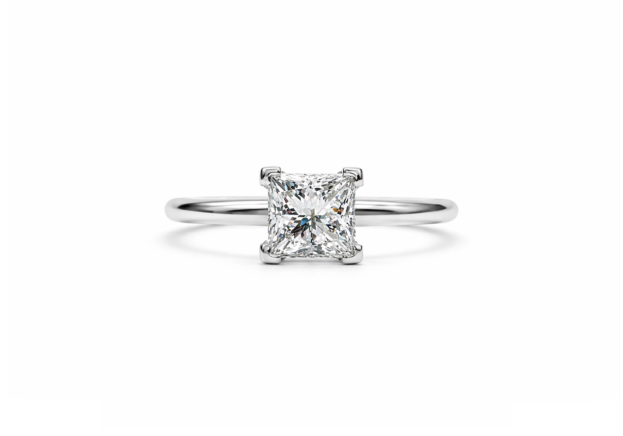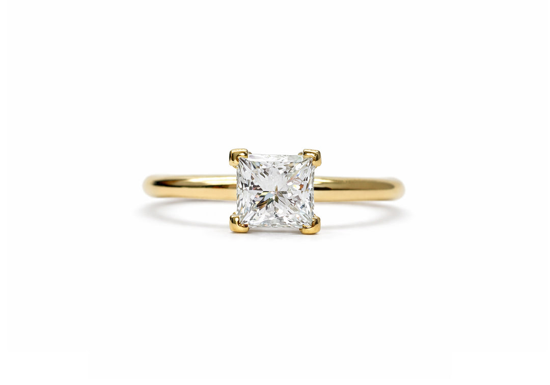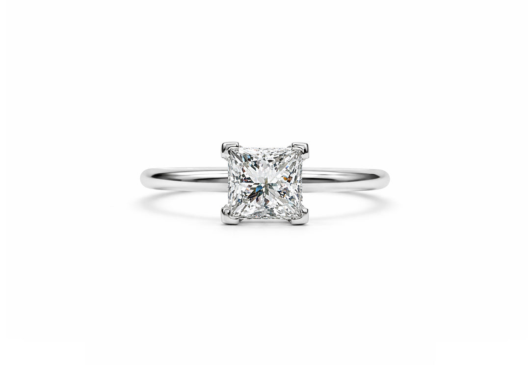 - Solitaire avec diamant de coupe princesse soutenu par 4 griffes carrées.
