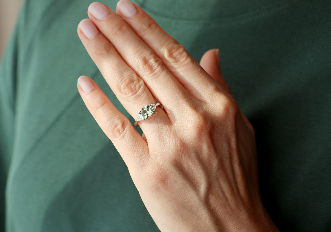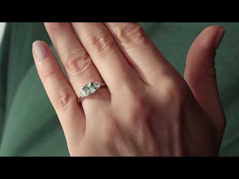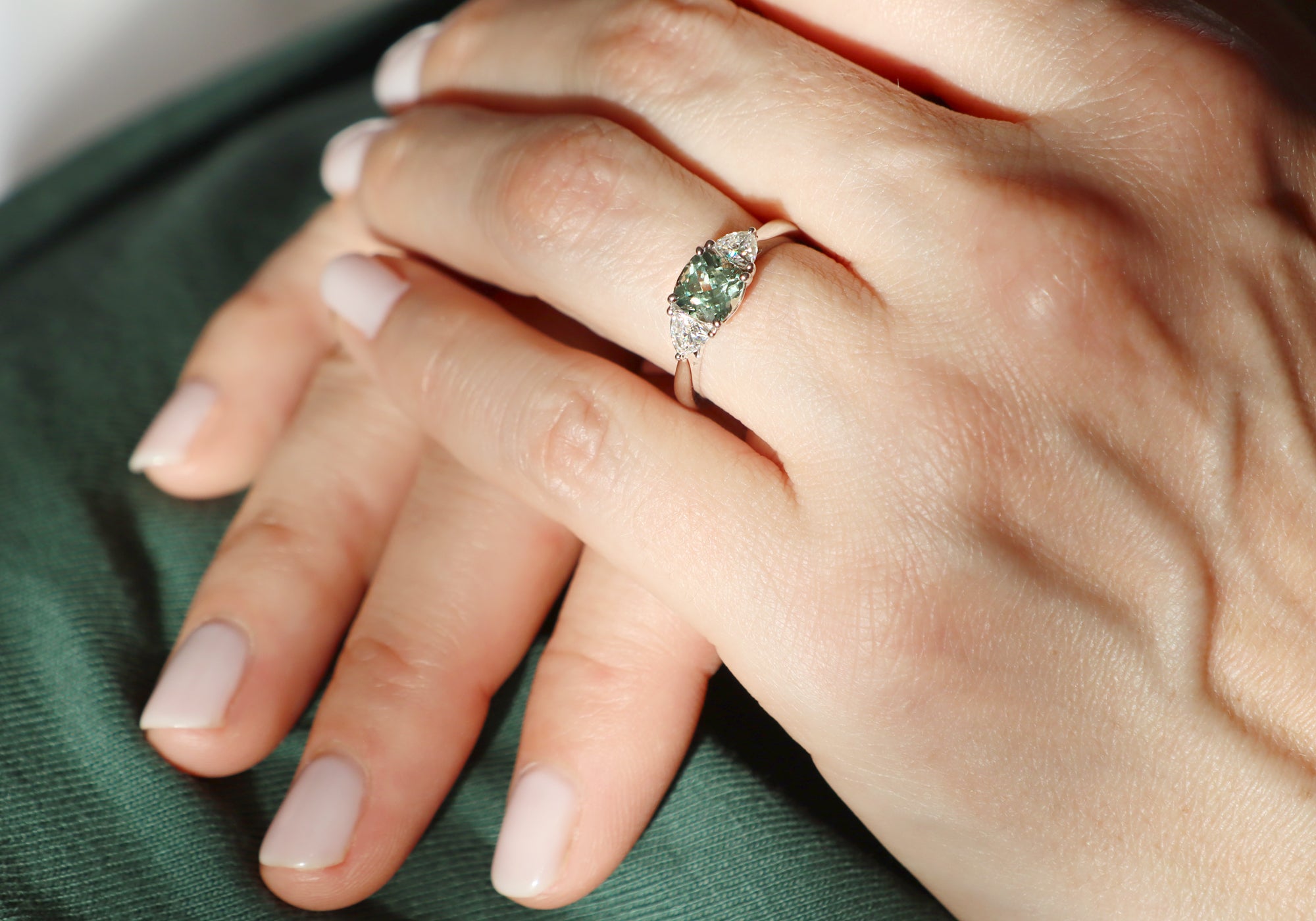 - La pierre centrale est un saphir vert créé en laboratoire.
