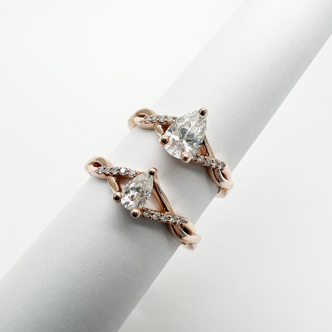 Bague de fiançailles avec diamant de forme poire et pavé de diamants en semi-éternité.