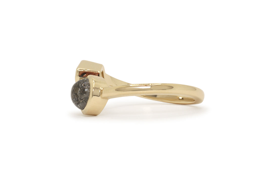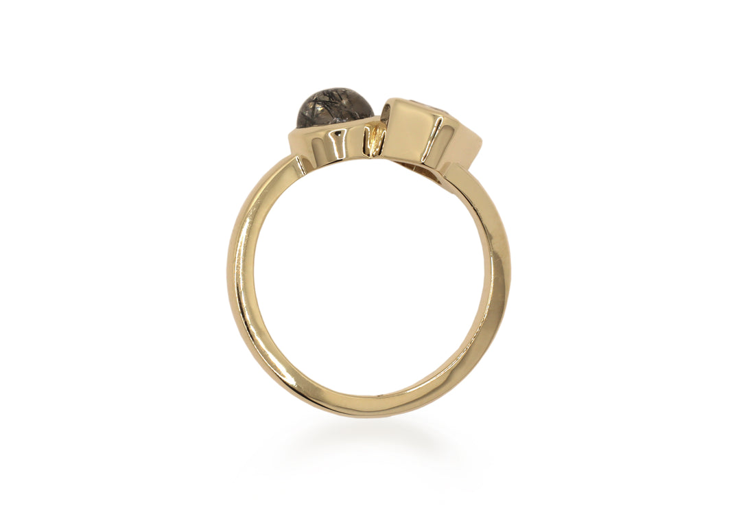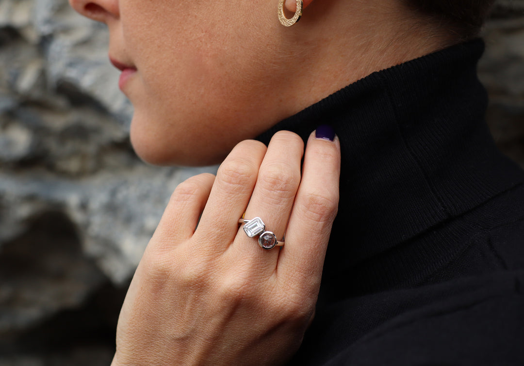 - Bague en or avec deux pierres centrales et corps de bague asymétrique.