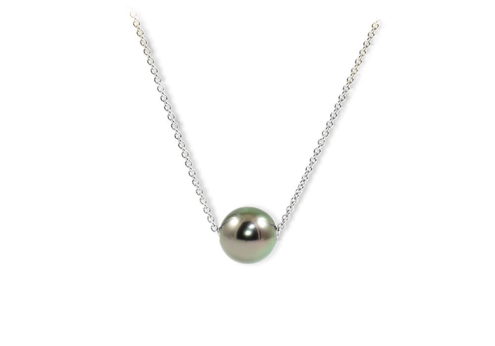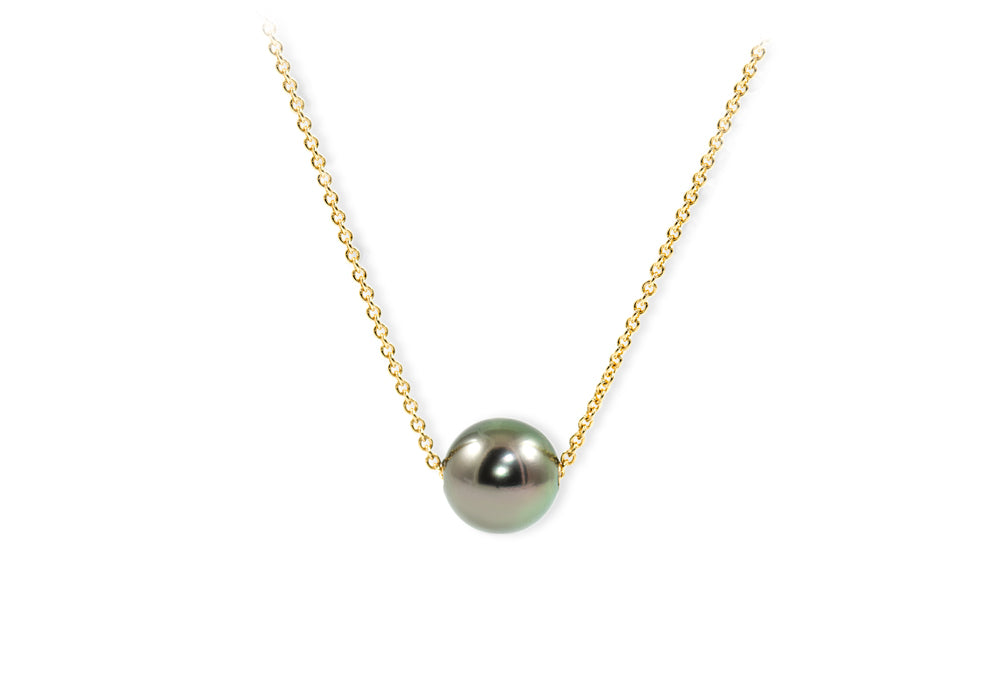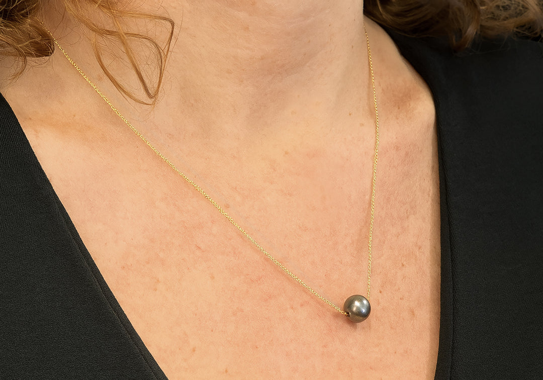 - Collier avec une perle de Tahiti percée et enfilée librement sur une chaîne solide et délicate.