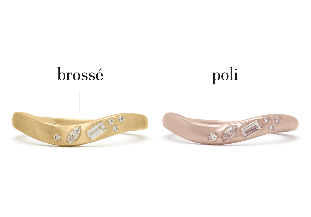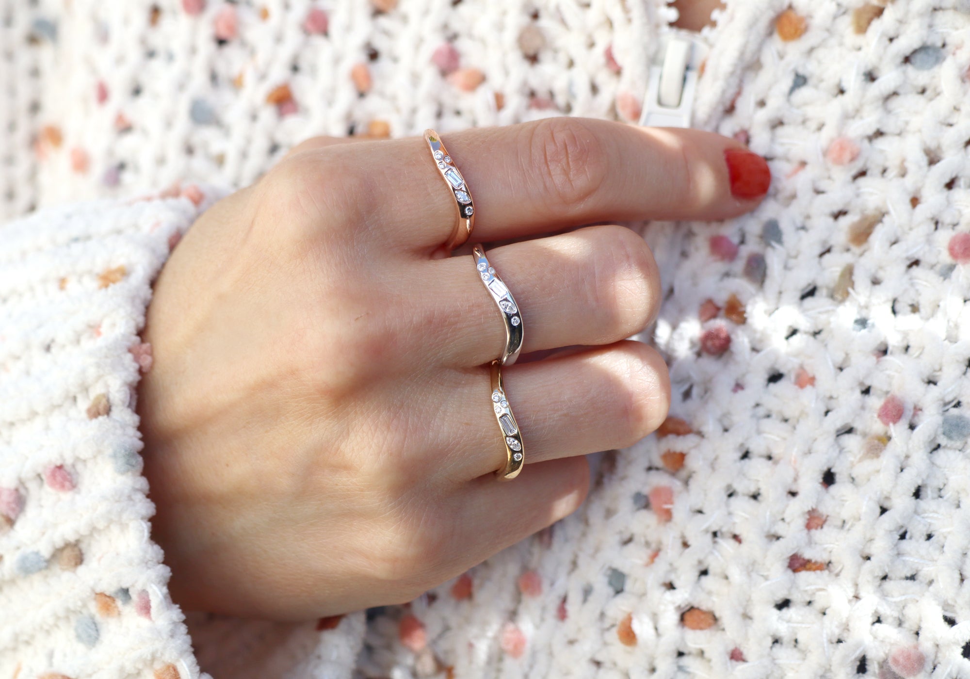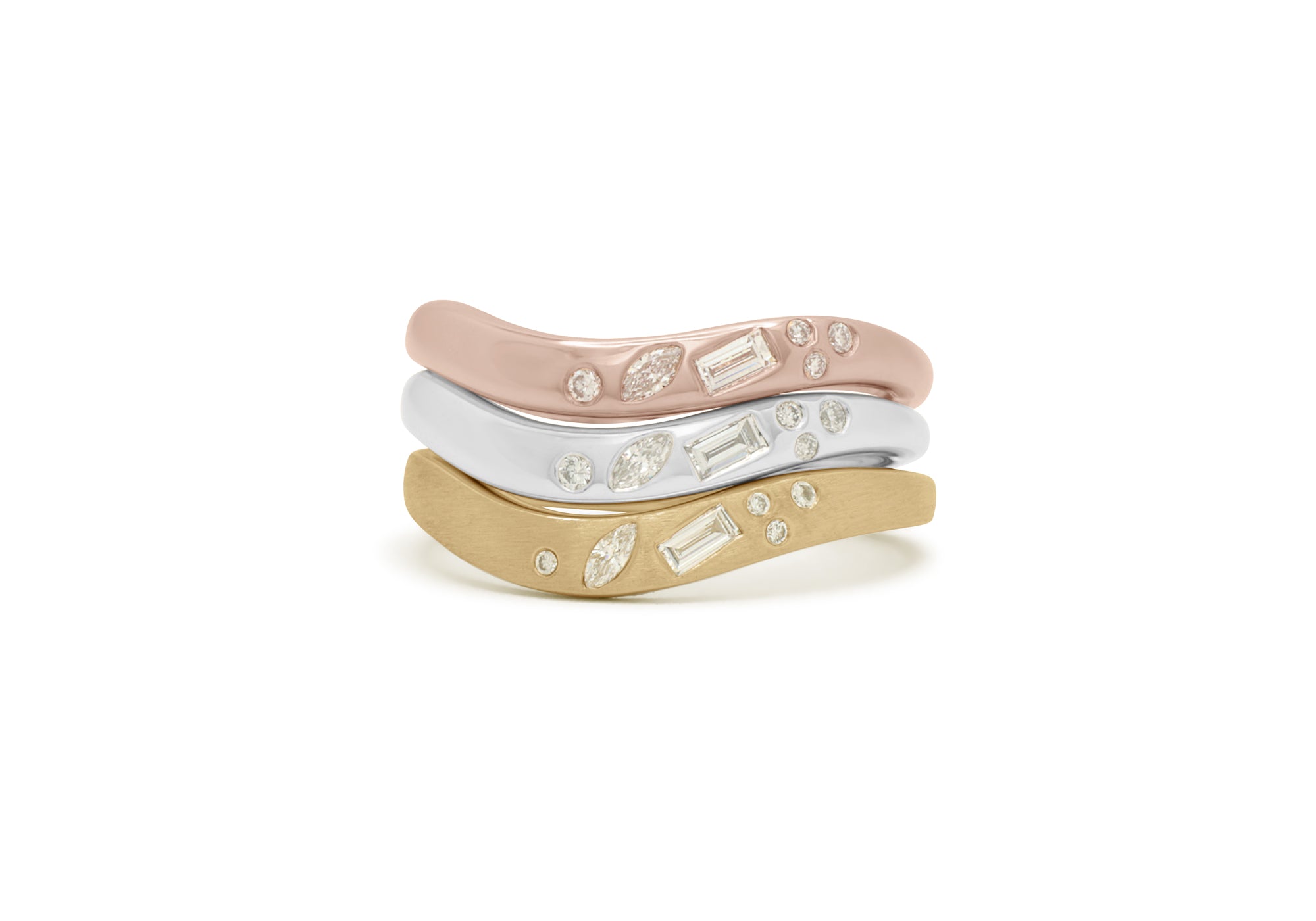 - Jonc pour femme courbé avec pavé de diamants aux formes mixtes.