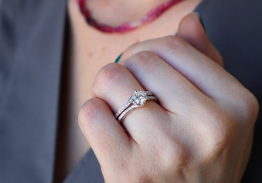 - Jonc de mariage semi-éternité avec une douce courbe pour épouser parfaitement la bague de fiançailles.