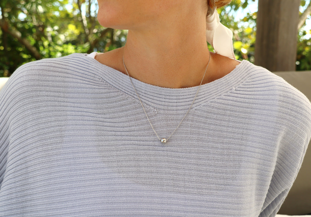 • La boule est percée et enfilée librement sur une chaîne en argent sterling délicate.