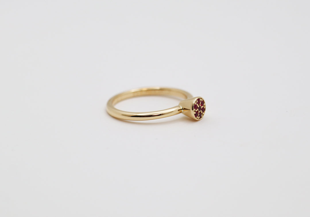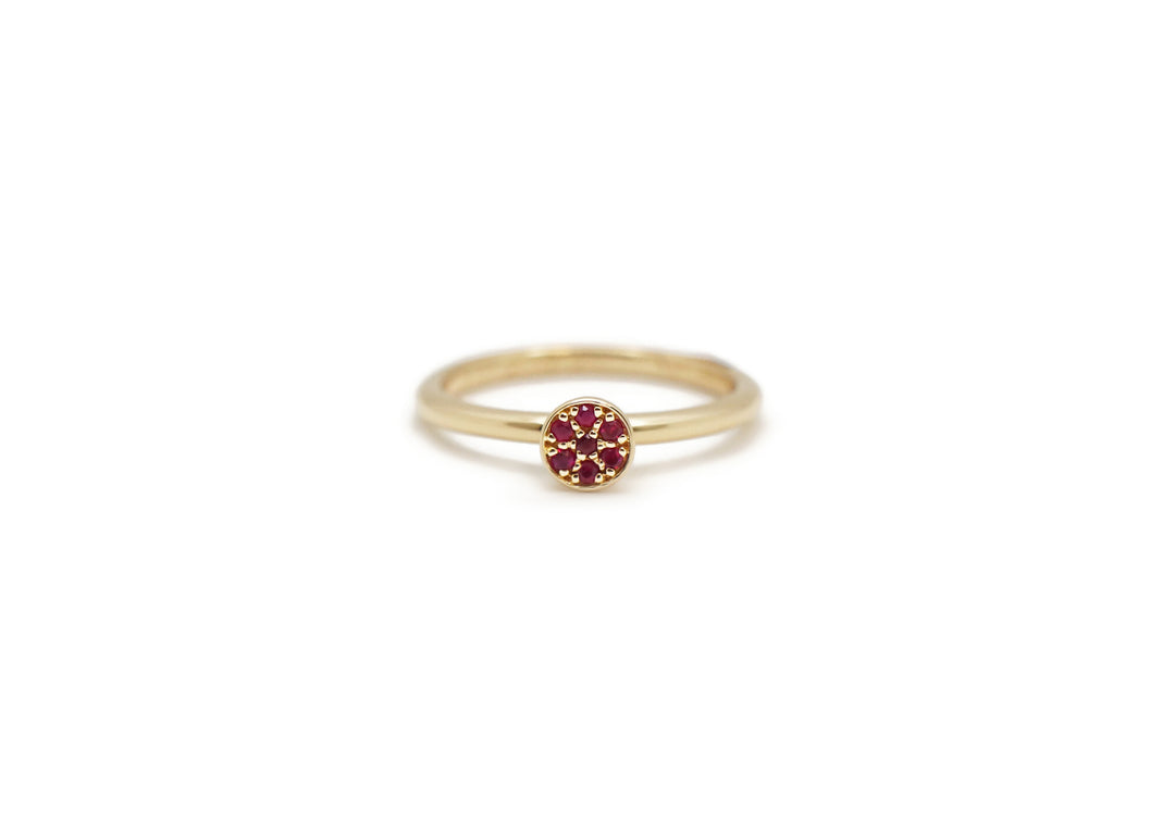 - Bague avec tête ronde pavée de rubis rouges naturels.