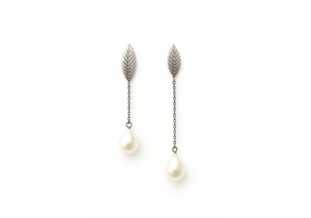 • Boucles d'oreilles avec feuille à l'oreille et perle goutte pendante.