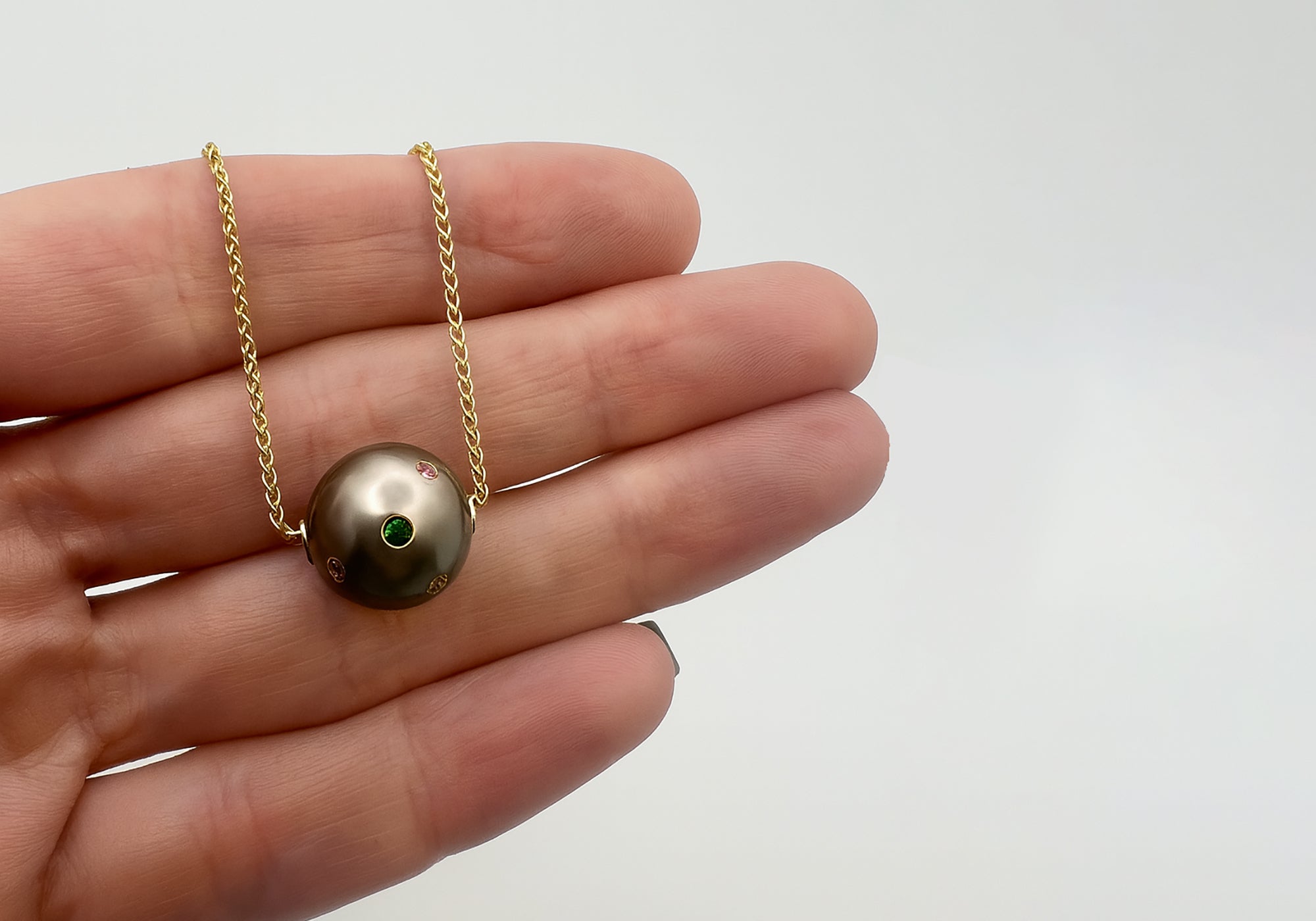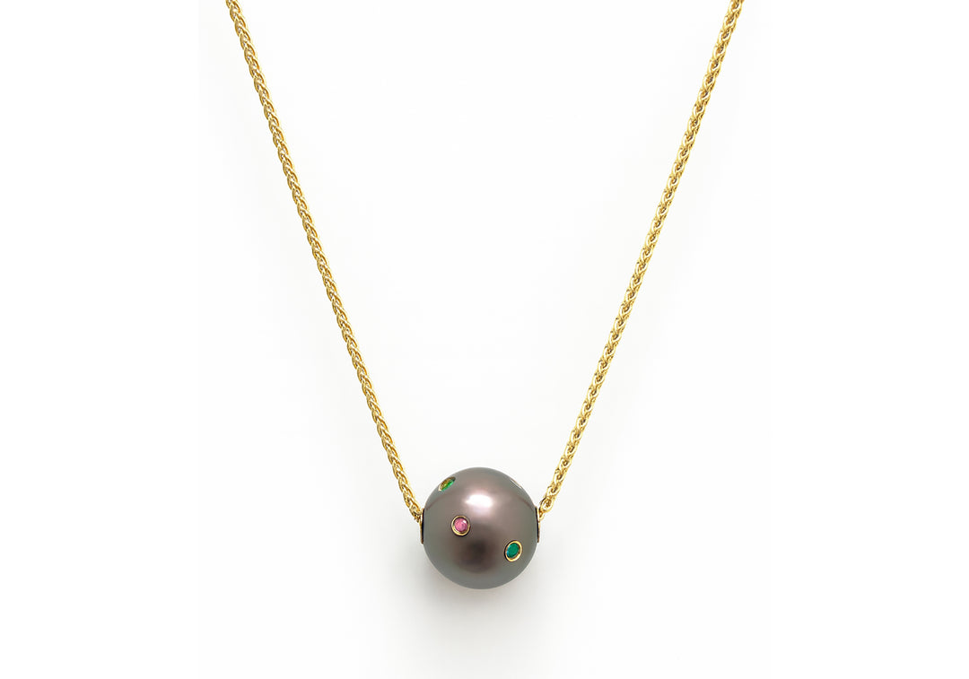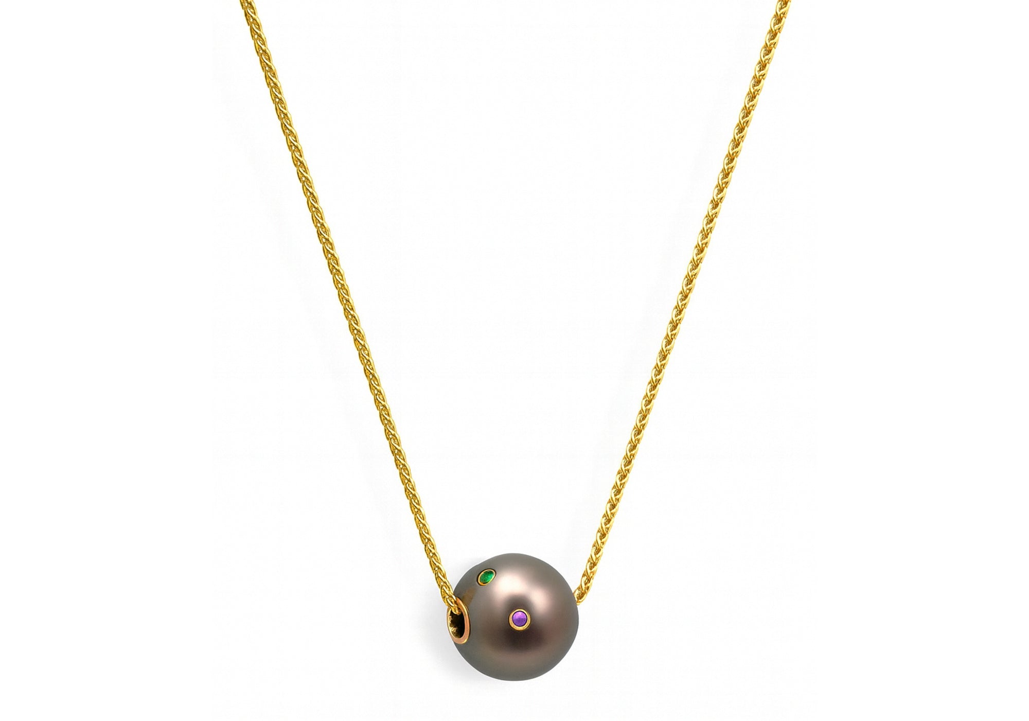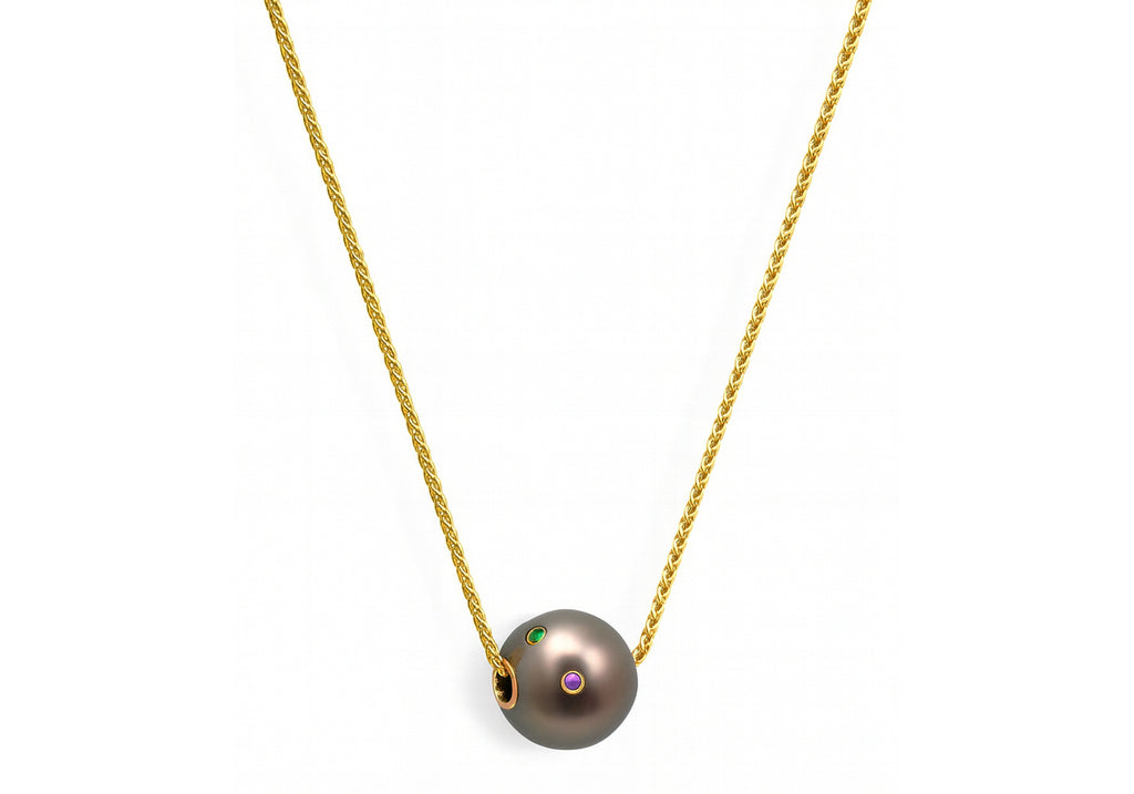 • Des saphirs roses, saphirs jaune et émeraudes sont incrustées dans cette perle