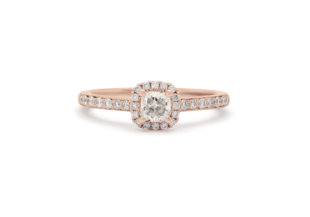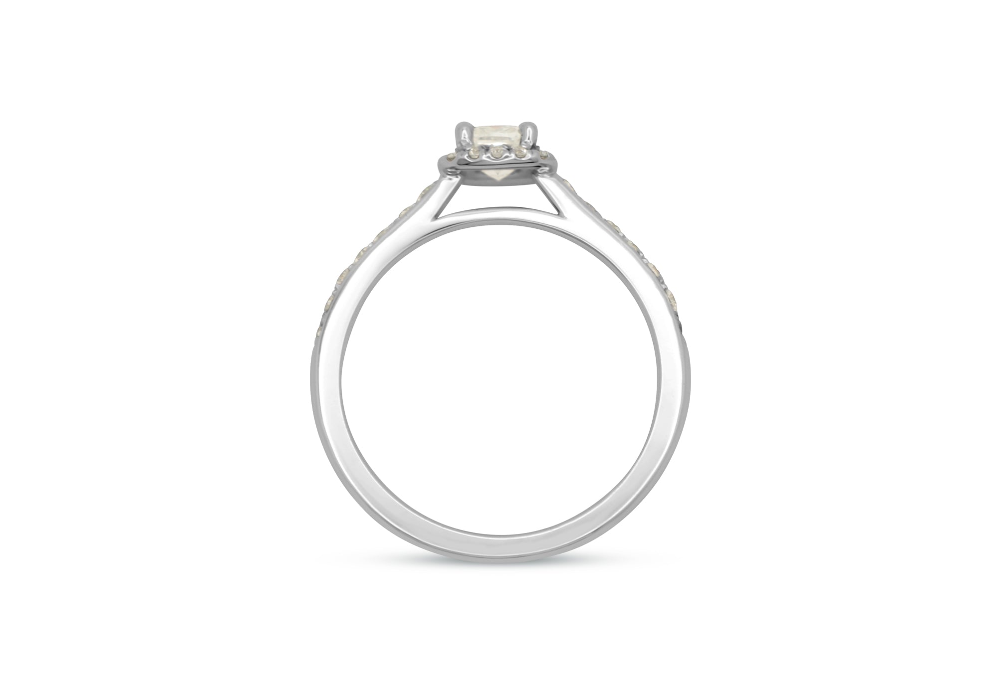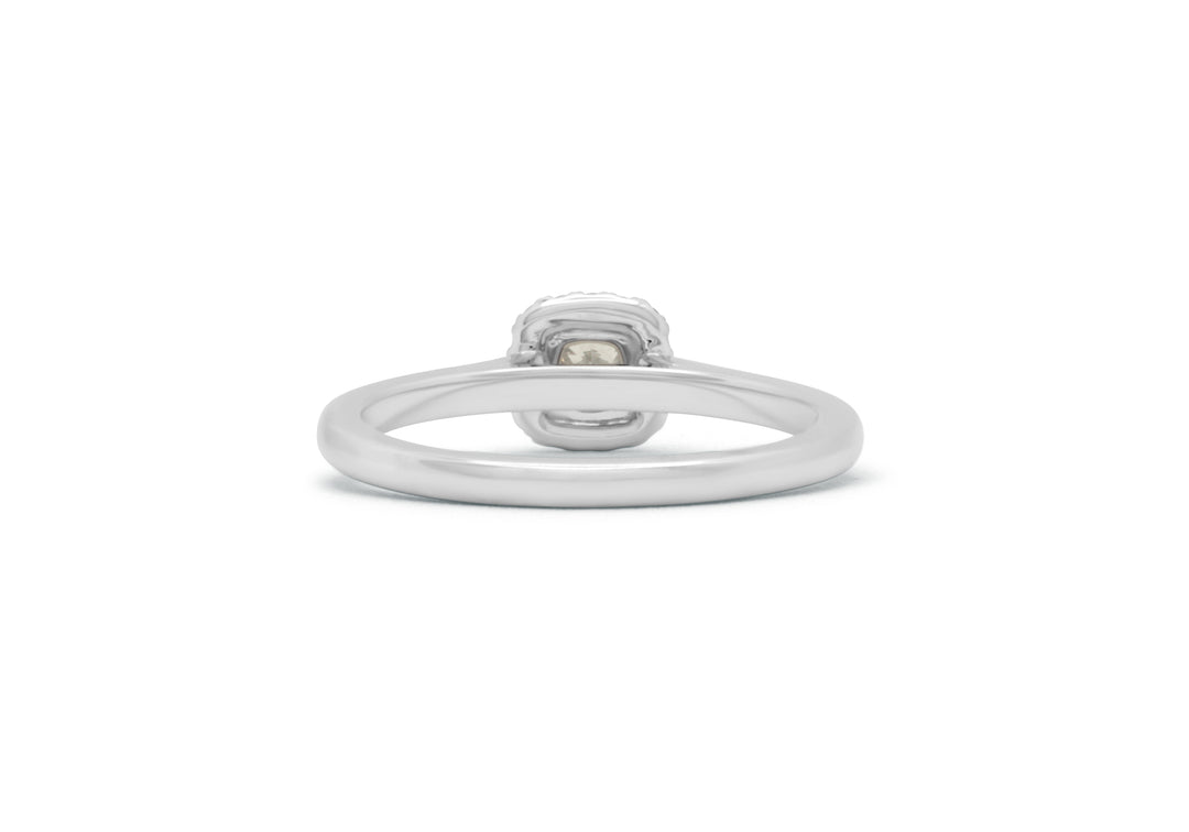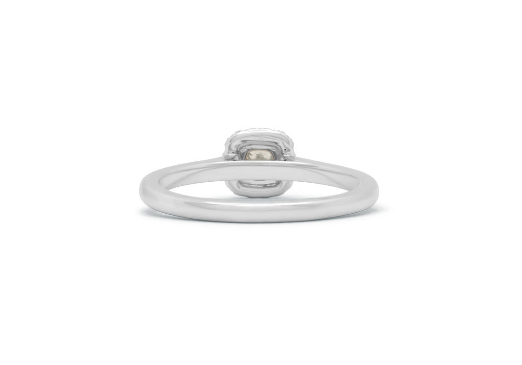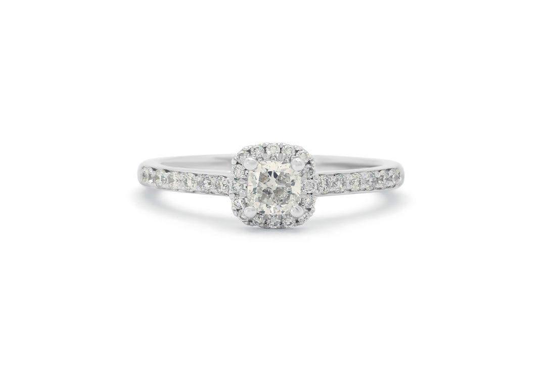 Bague de fiançailles pour femme avec diamant central de taille coussin et halo de diamants.