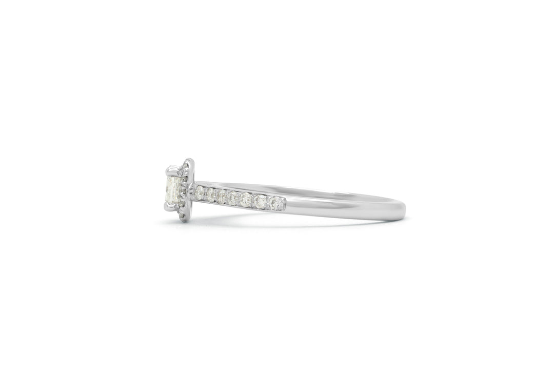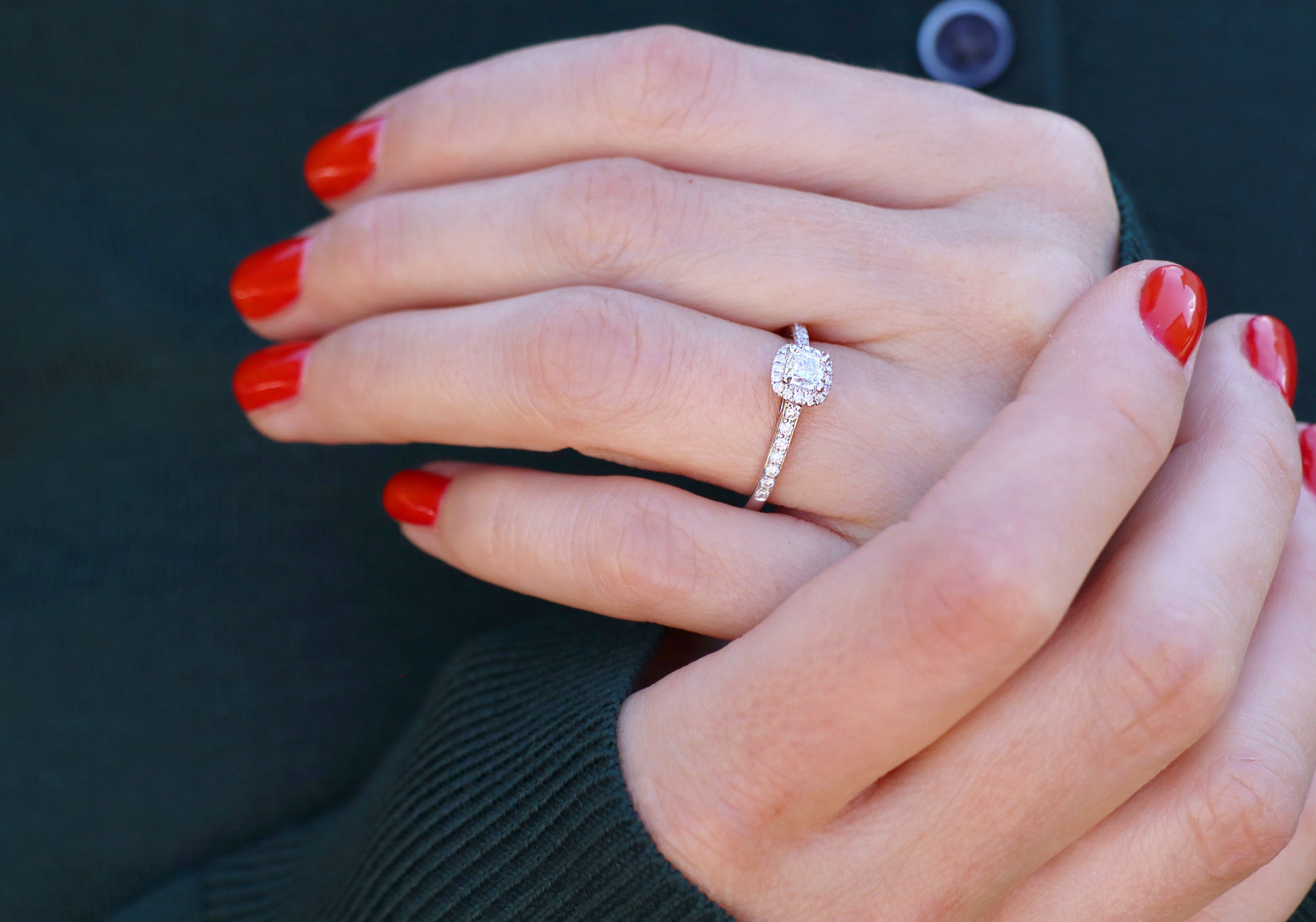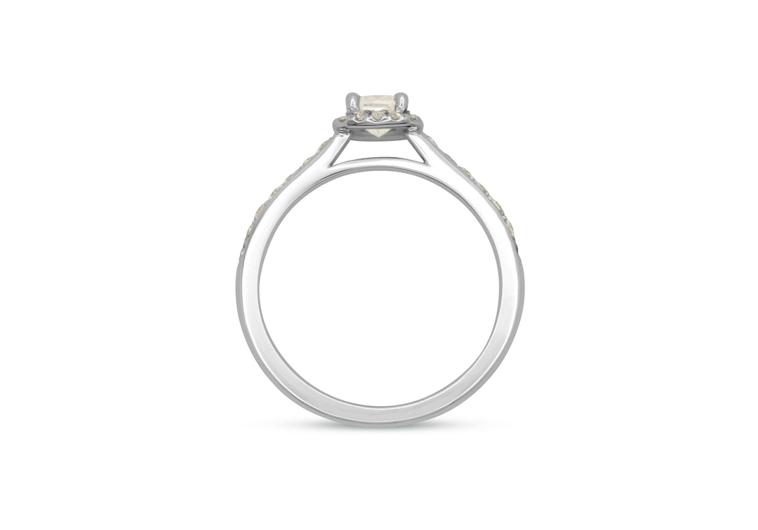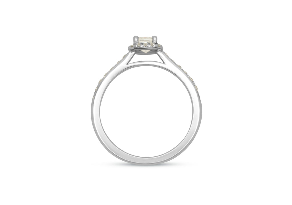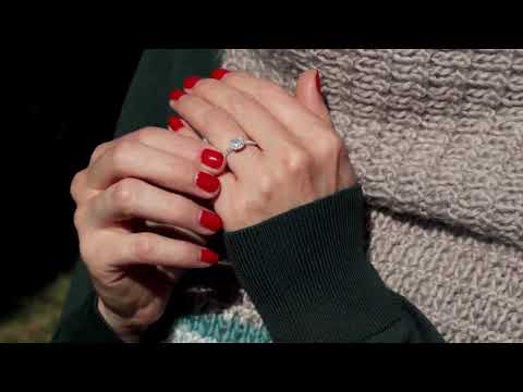 Bague de fiançailles pour femme avec diamant central de taille coussin et halo de diamants.