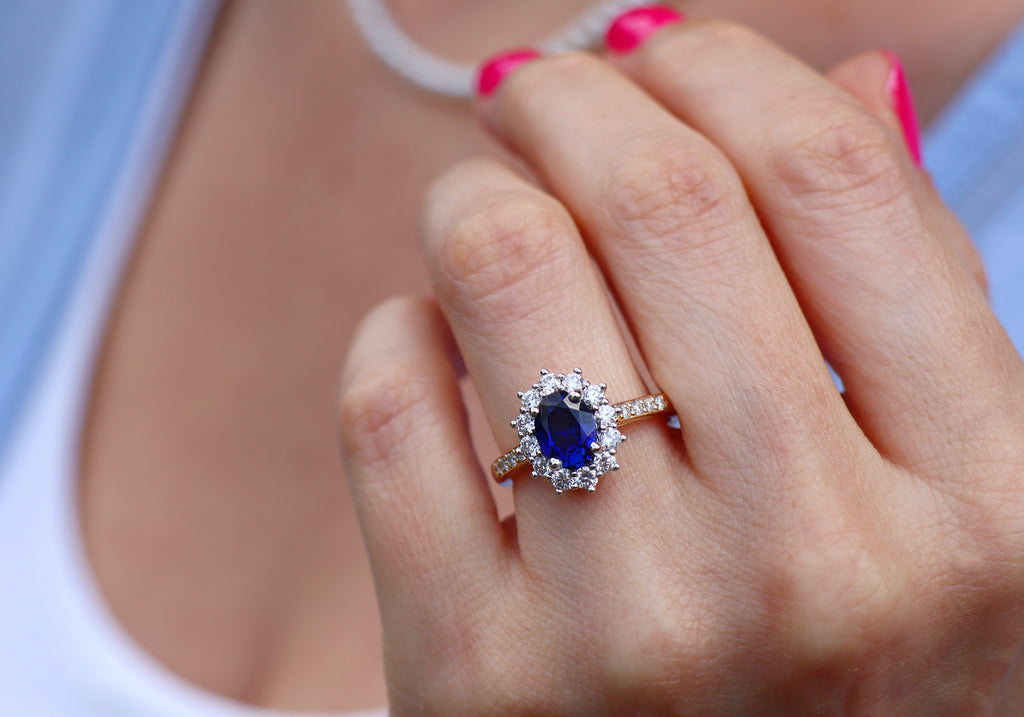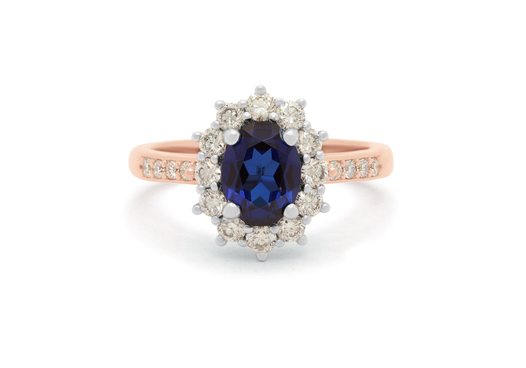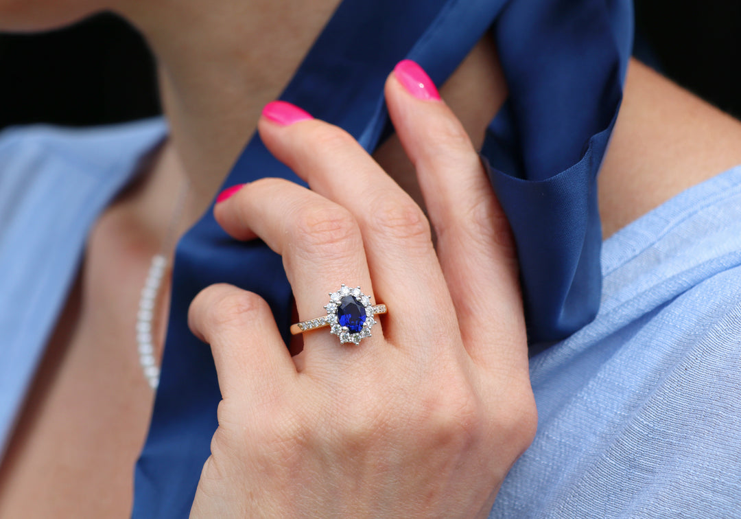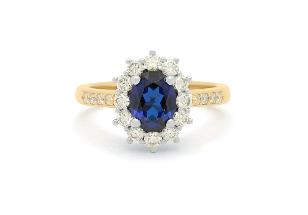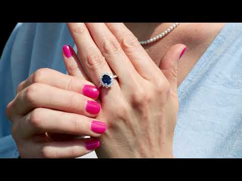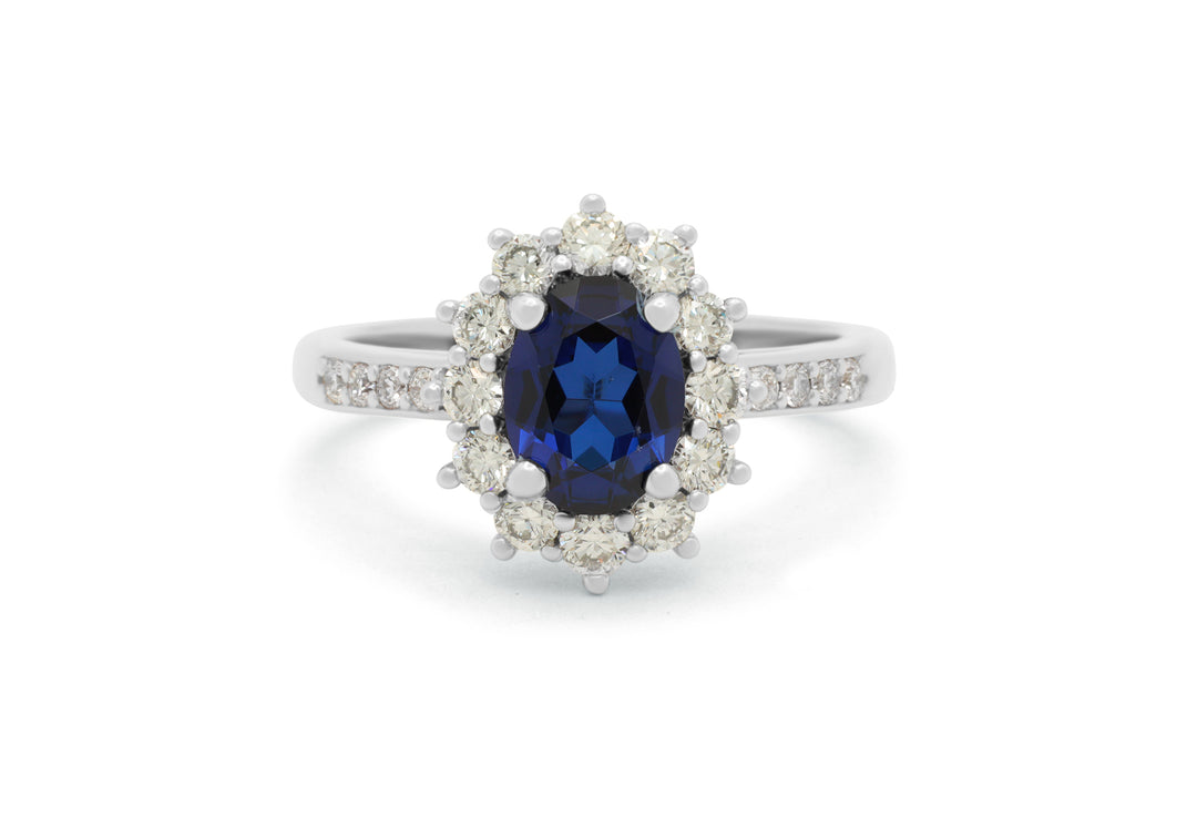 - Le centre de la bague est un saphir ovale entouré d'un halo de 12 diamants.