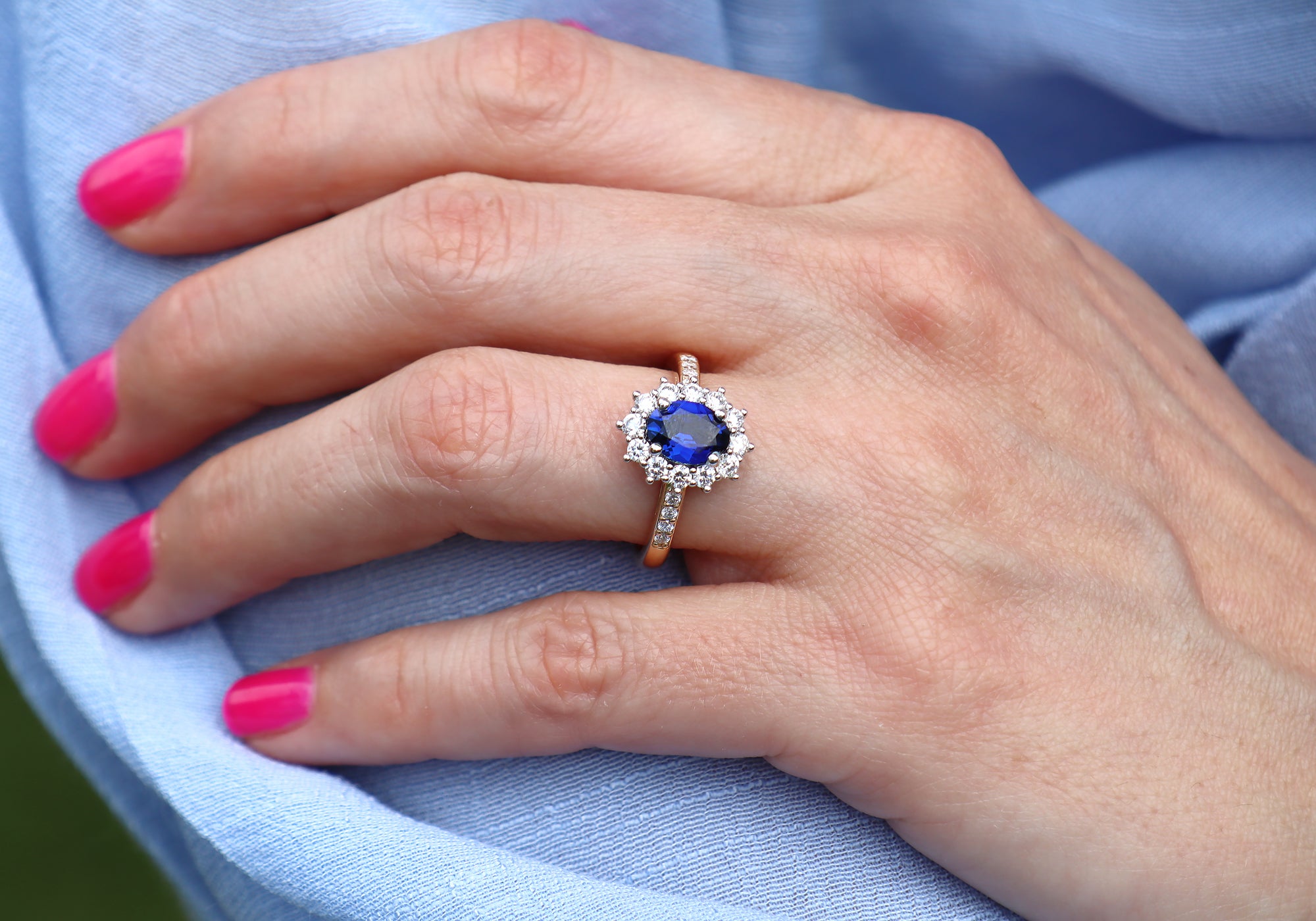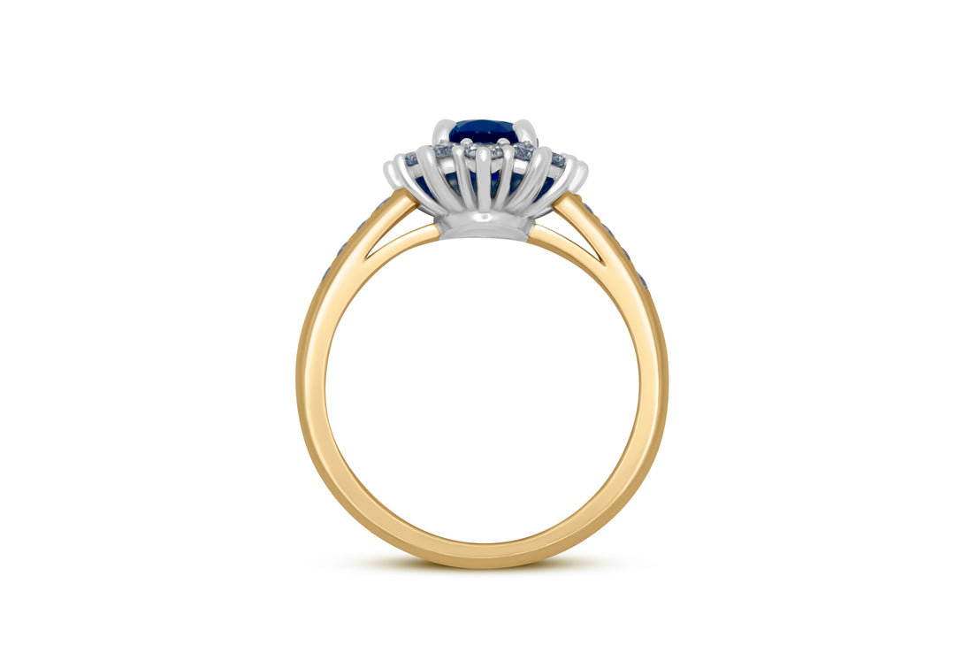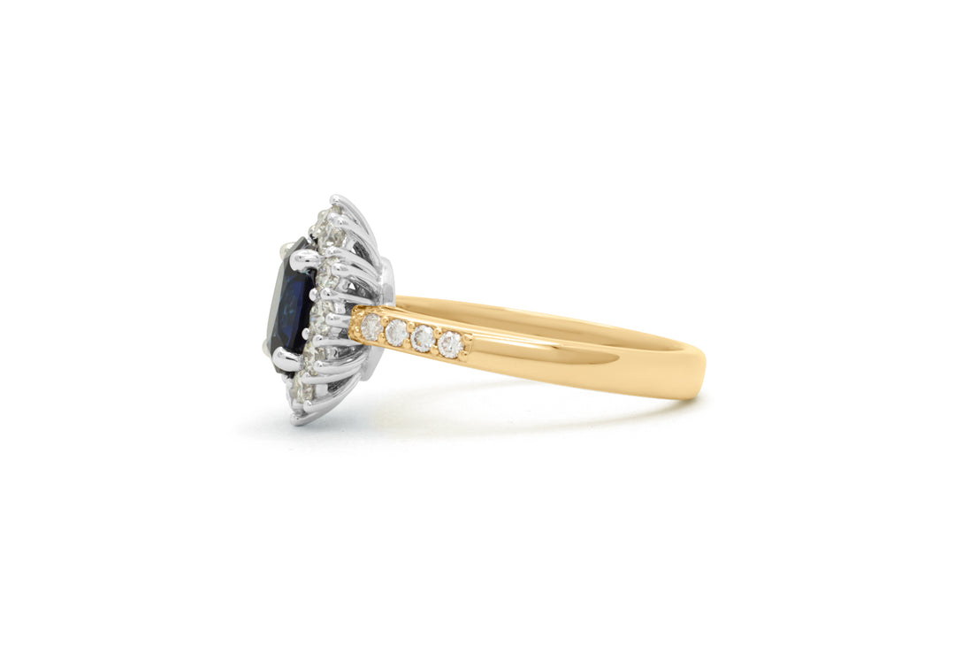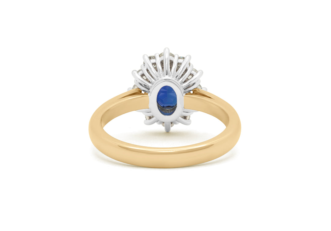 - Le centre de la bague est un saphir ovale entouré d'un halo de 12 diamants.