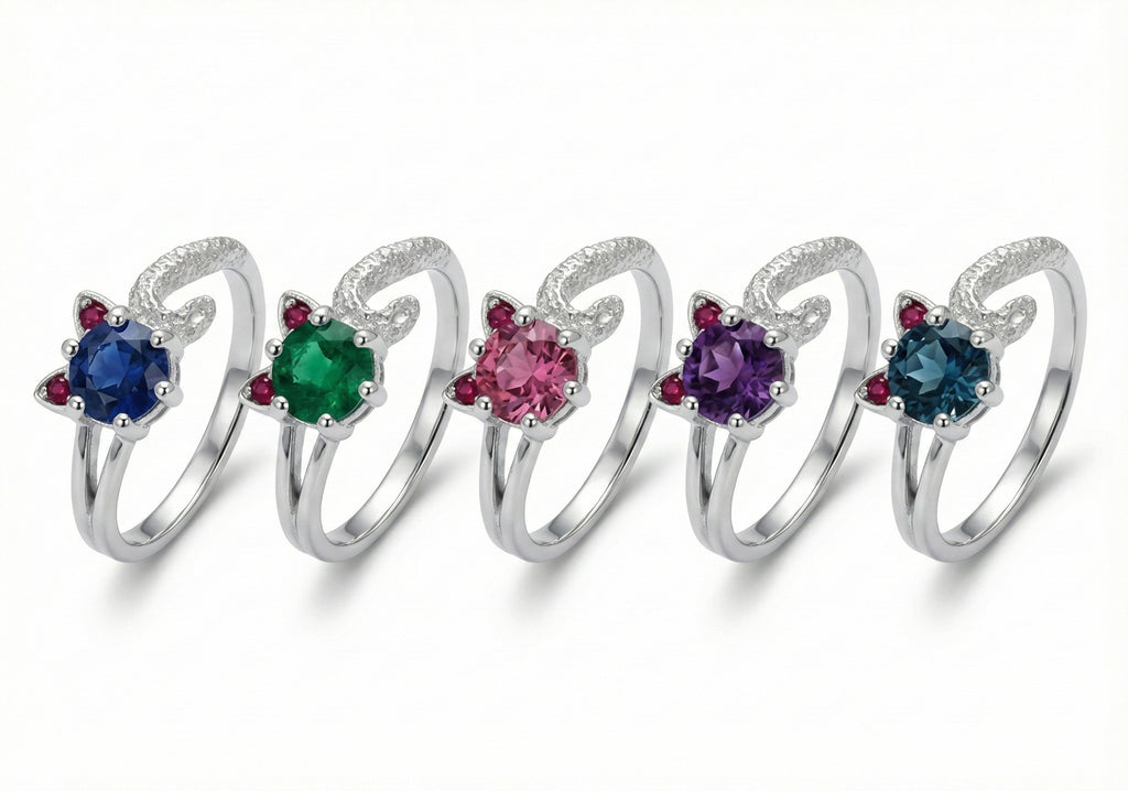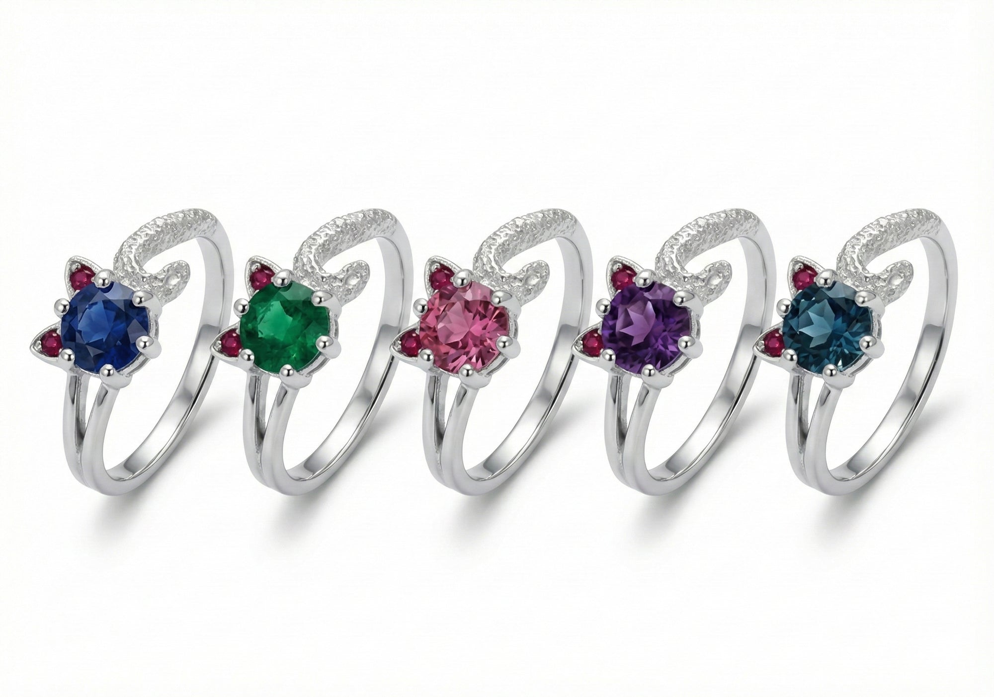 - Choix de couleurs pour la pierre centrale: améthyste, topaze bleu, tourmaline rose, rubis de laboratoire, saphir de laboratoire et émeraude de laboratoire.