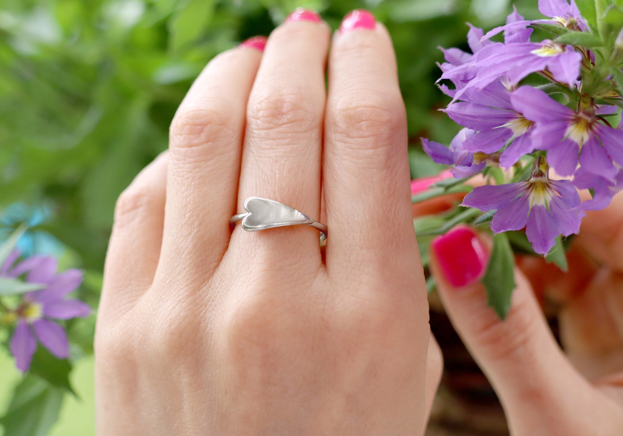 - Un coeur allongé suit élégamment la courbe du doigt.