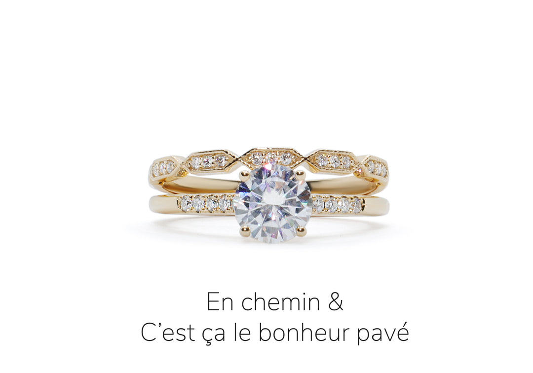 - Solitaire classique avec côtés pavés et pierre centrale de 0.50 ct, 0.80 ct ou 1 carat.