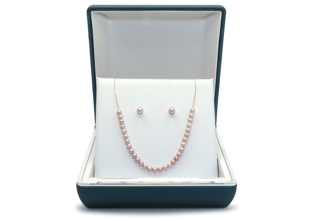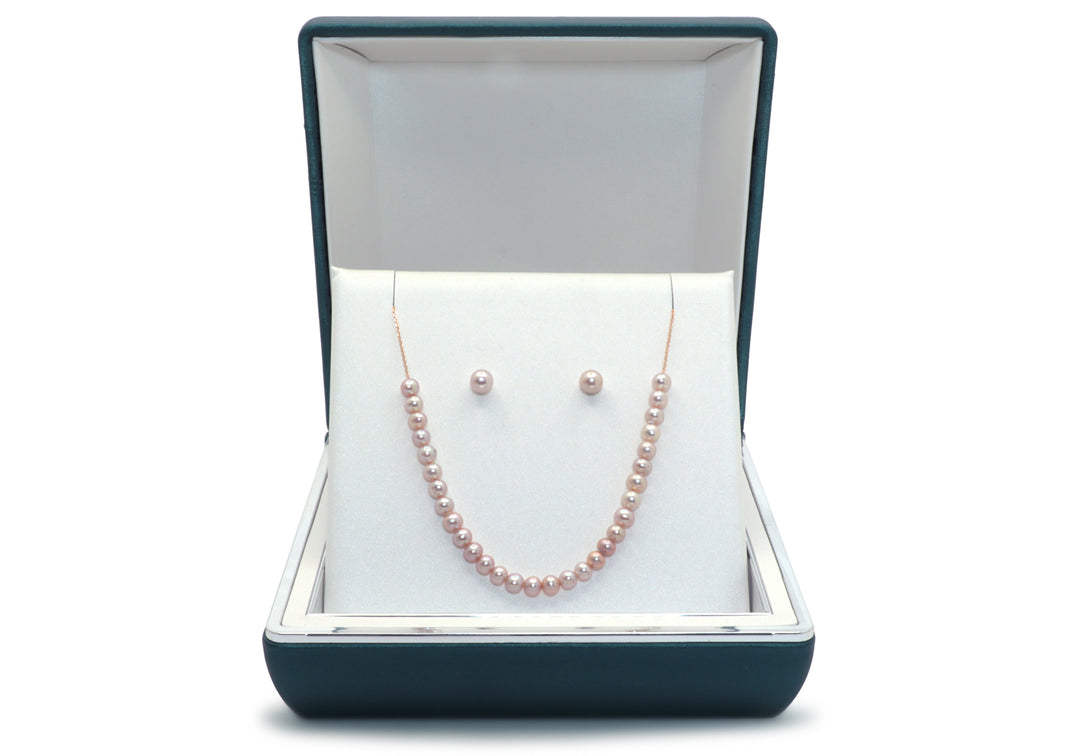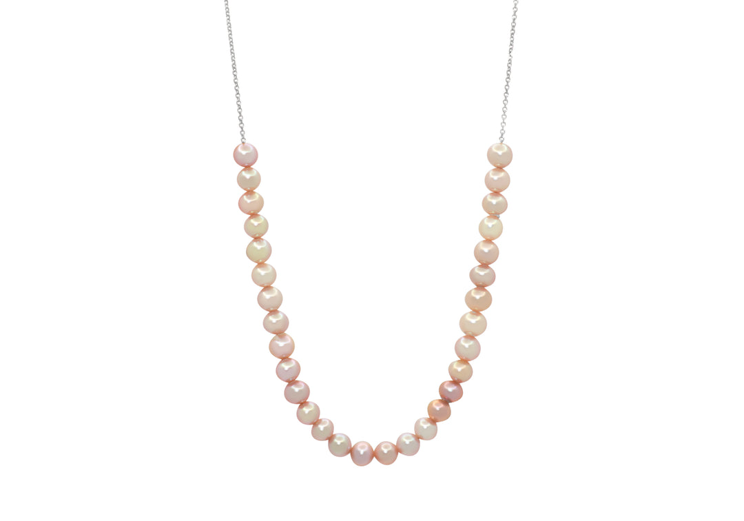 - Trente perles d'eau douce de teinte rosée de 4 mm alignées sur un collier en or.