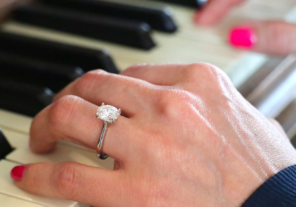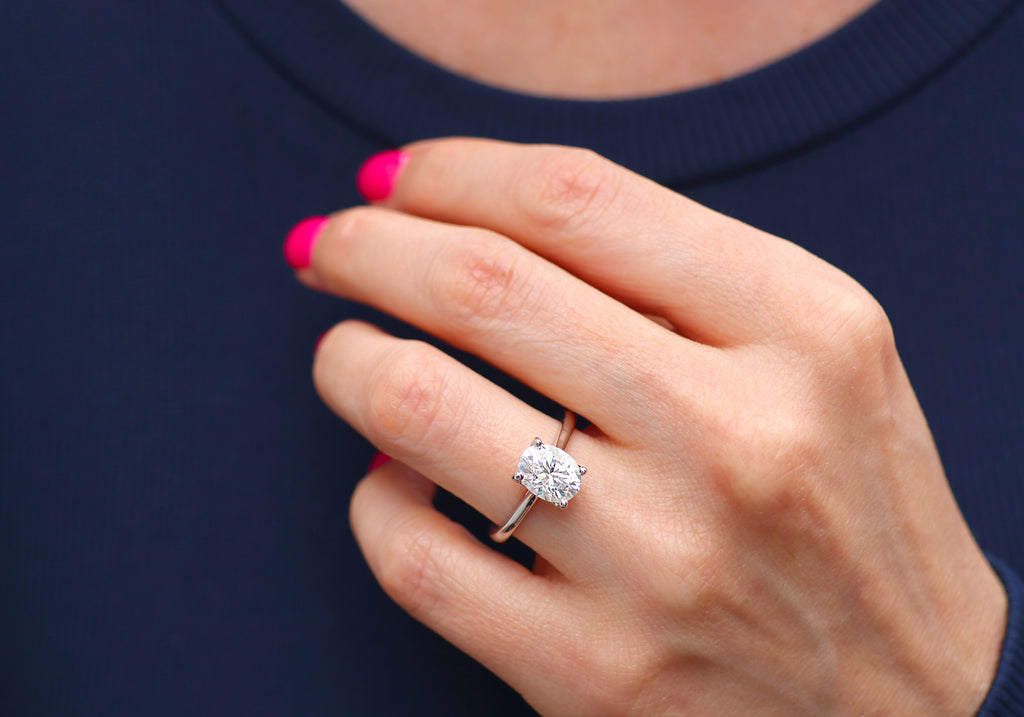 - Solitaire classique avec une pierre ovale de 2 carats serti sur griffes.